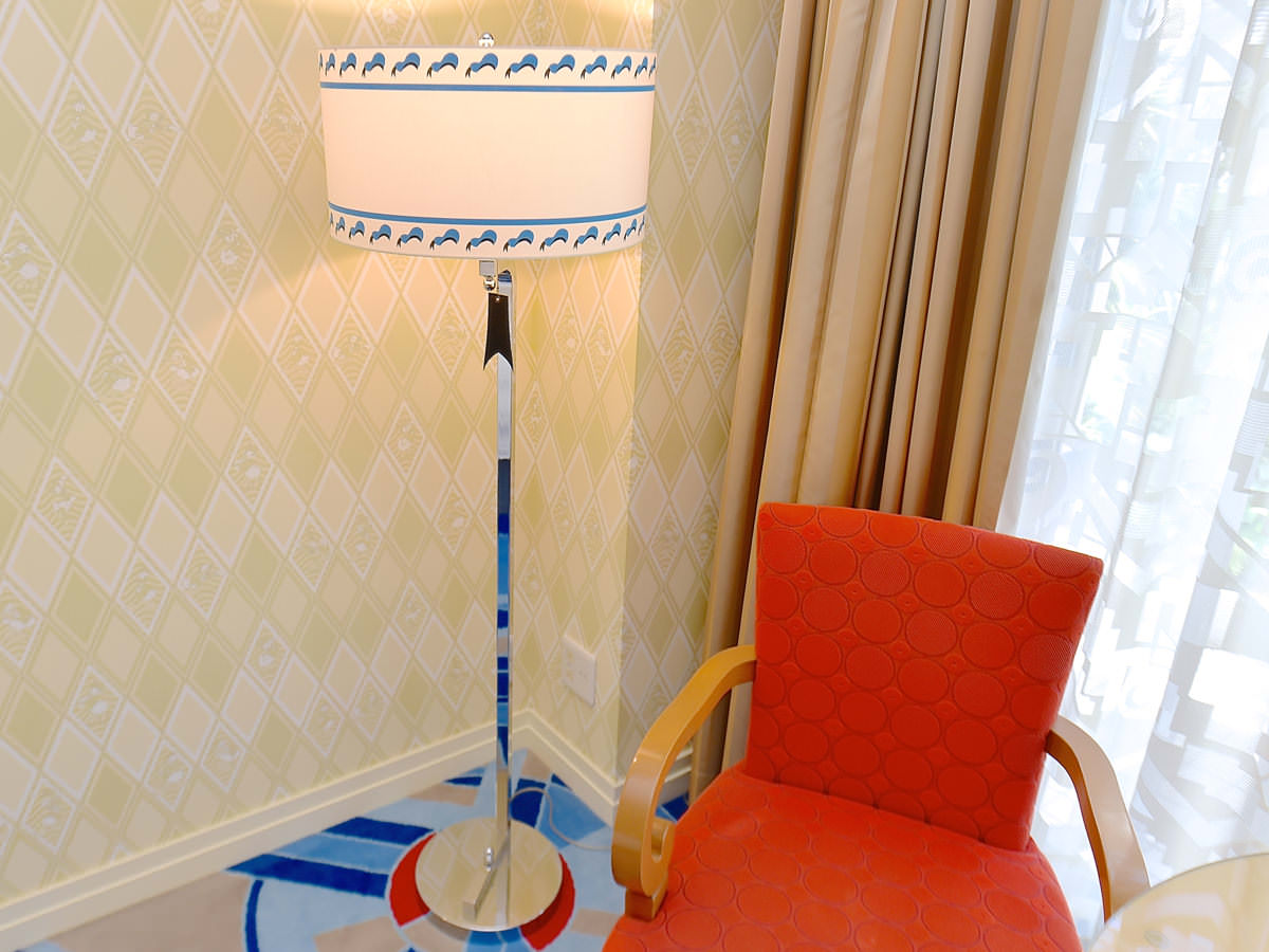 四周也以充斥著醒目的寶藍色搭配黃色、紅色等,以活潑色彩作為基調,唐老鴨俏皮的身影更是融入了地毯、壁紙、沙發等房間設備中,陪伴遊客度過整晚的住宿時光。
