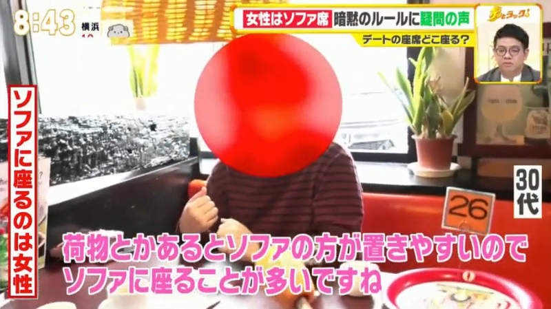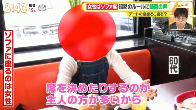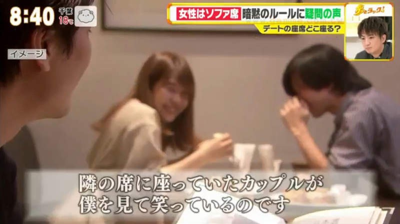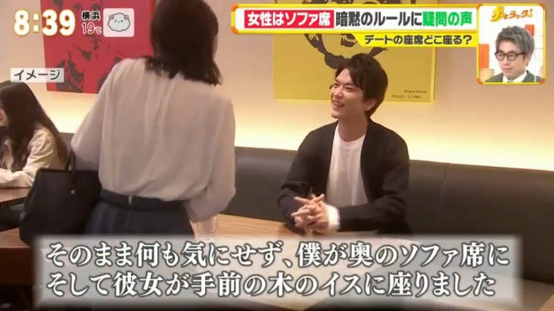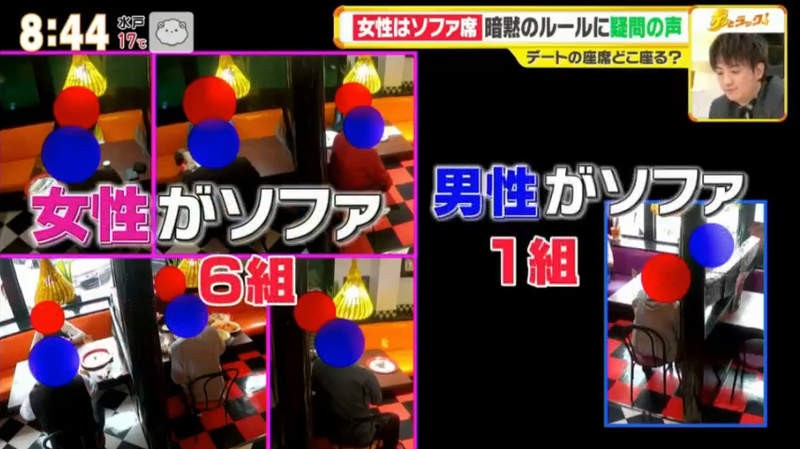 其後有一間日本電視台就著這熱議的話題而真的作出研究,到底多少情侶是真的會在乎並遵守這個「餐廳坐法潛規則」呢?電視台在一間餐廳中設置了鏡頭,看看有多少情侶會讓女生坐裏面的梳化。