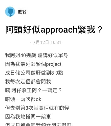 事緣樓主最近正跟進公司一個項目,幾乎每天都要加班至八、九點才下班。而那位聽說是單身的女上司每次都會問他:「咦,阿仔收工阿?一齊走?」,樓主表示頭一、兩次還算正常,但去到第三次就開始懷疑對方的用心。