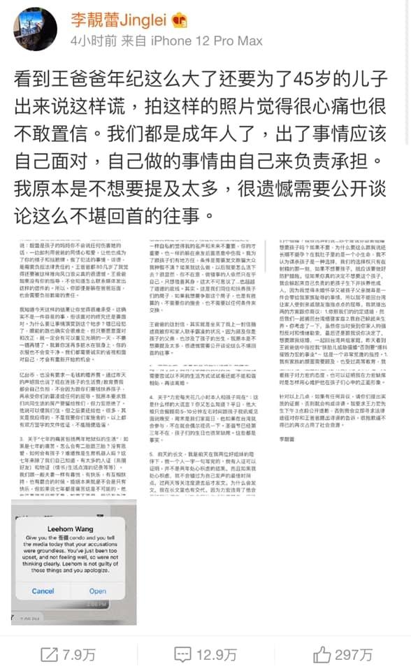 王爸爸在內文提到當初李靚蕾是因為懷孕後要脅王力宏成婚,而多年來的婚姻都是痛苦的,但王力宏與李靚蕾結婚9年,誕下3個孩子更不時在媒體和自己的社交網站上曬恩愛都是大家親眼所見,不得不說果然是心機男。