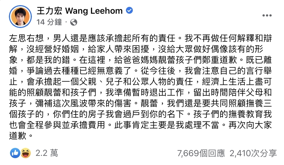 王力宏李靚蕾離婚一事炒得沸沸揚揚,除了前妻李靚蕾,連王爸爸王大中、自稱前女友的By2 Yumi、不知為何捲入事件的徐若瑄也紛紛發出相關聲明後,神隱2天的「男主角」當事人王力宏終於在(19日)深夜時分於網上發文回應事件,否認大部份指控但仍有道歉。詳情如下: