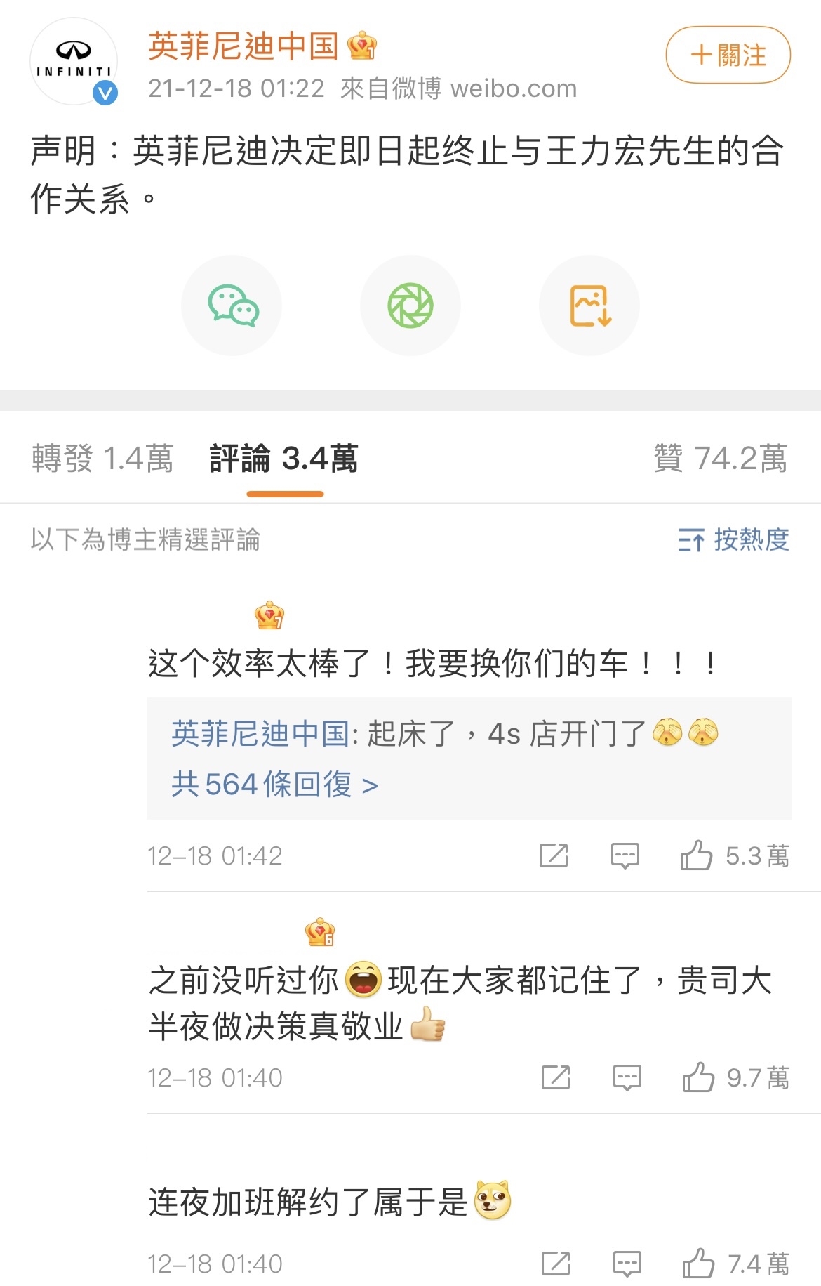 除了遭央視封殺,內地各大品牌也紛紛和王力宏終止合作,當中動作最快的是汽車品牌 INFINITI(英菲尼迪),代言人出事後兩小時就解約的超高效率讓網民大讚:「這個效率太棒了!我要換你們的車!」、「之前沒聽過你,現在大家都記住了,貴司大半夜做決策真敬業」。
