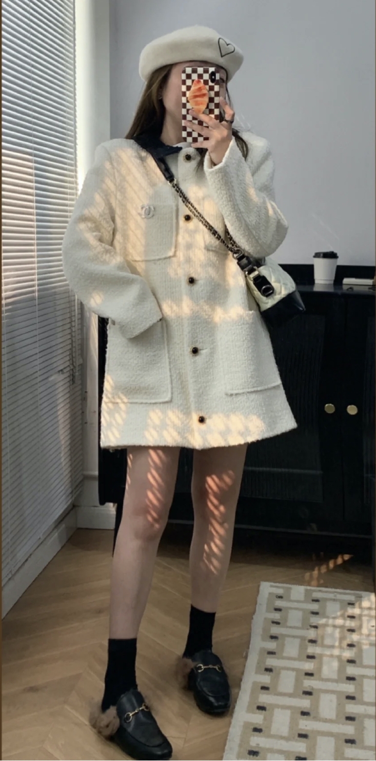 對於腿長或是身型嬌小的女生,可以找一些版型偏長又較寬鬆的小香風外套,再把鈕扣全扣上,當成連身裙穿著,再加上一對長靴或高踭鞋,便著出一身高級千金風~