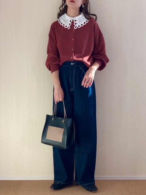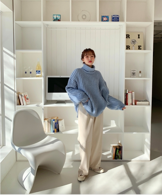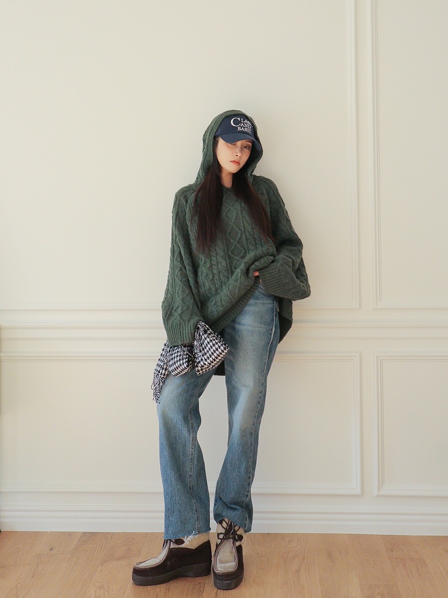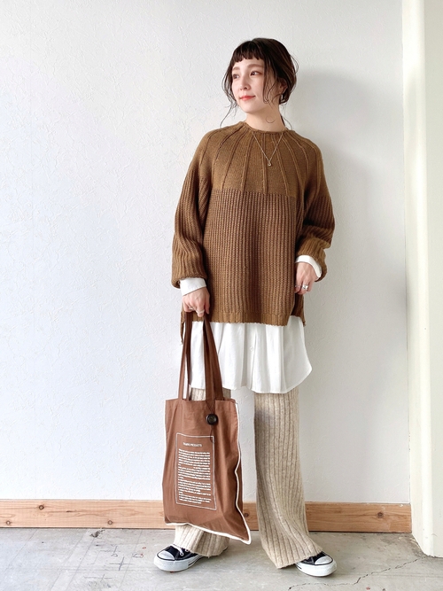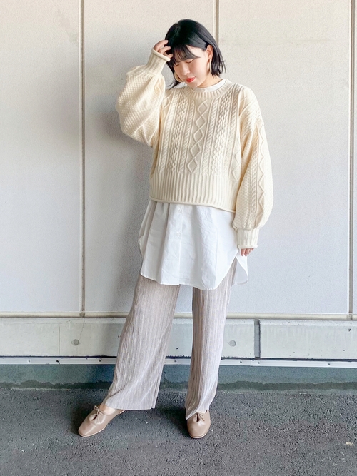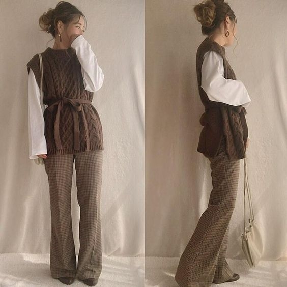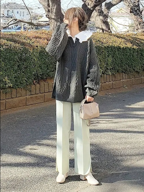 上下同樣寬鬆的搭配,散發出慵懶感~如果怕太單調,上衣可以揀選帶有針織花紋的冷衫,像是粗麻花扭紋、直間紋或是菱格紋等,看上去會更有質感!