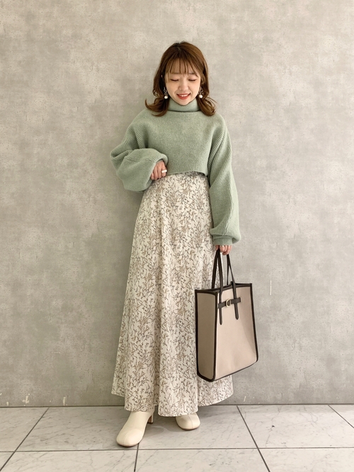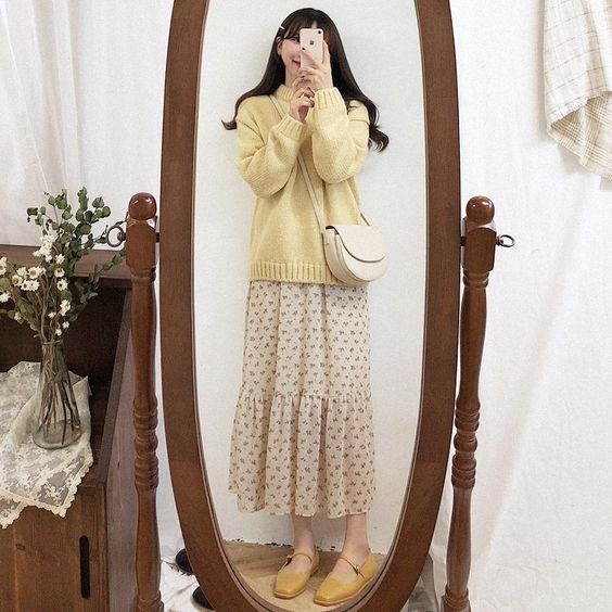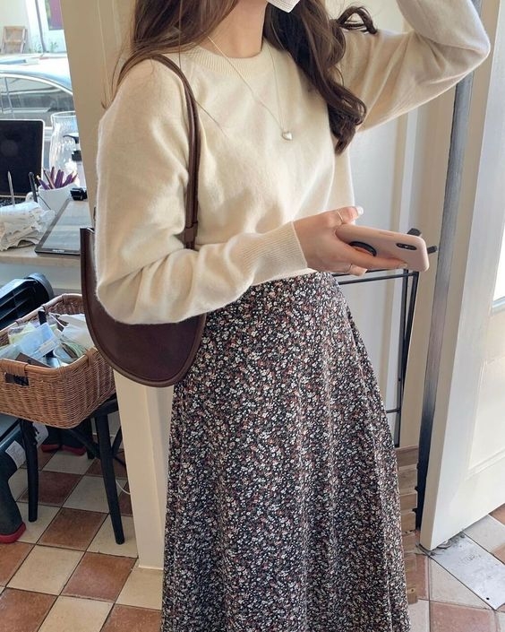 以不同材質的單品來混搭,冷衫看上去比較溫暖和厚實,配搭透薄又飄逸的碎花長裙,不突兀又充滿日系溫柔感!