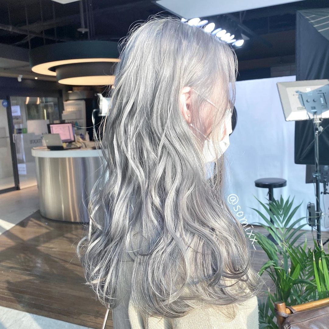 以灰色混合銀色形成銀河灰色調,染髮後深灰色會較突出,同時散發著銀色的微微通透感~對於冷調膚色的女生更加適合,顯氣色又十分有仙氣~