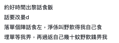 另外又有網民提到自己曾約異性外出吃飯,但對方突然把約定時間推後,兩人去到餐廳準備點餐的時候,對方才表示自己已經吃過飯,所以只叫了一杯飲品,在結帳的時候讓女生先付錢,之後再把飲品錢給對方。此舉令該網民感到非常不尊重,認為對方沒有誠意繼續發展,對方只看著自己吃飯也有點尷尬。
