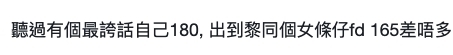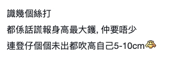 女性網民則較注重男生的身高,有網民表示自己身邊有幾位女性朋友最介意男生虛報身高,曾經遇過有男生把自己的實際身高加多5至10CM,但其實很容易被揭穿謊言。
