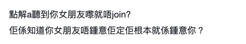 樓主亦有提到他最近又與好友有聚會,更承諾會帶女友出席,但朋友A聽到女友會一起後就堅決不出席,最後只好要求女友不出席,朋友A才願意一起玩。