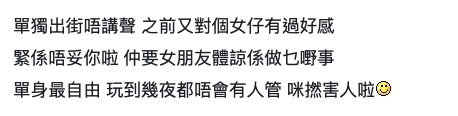 有網民看過樓主的煩惱就留言表示其實其女友的要求不過份,有女朋友就不應該與異性好友有太多的接觸,甚至單獨外出沒有與女友報備。紛紛勸喻樓主「放生你女友啦」、「分手啦!你同a襯啲」又要求樓主嘗試調轉角色,更指出如果女友與異性朋友單獨外出,兩人甚至聊天到半夜,樓主又能接受嗎?