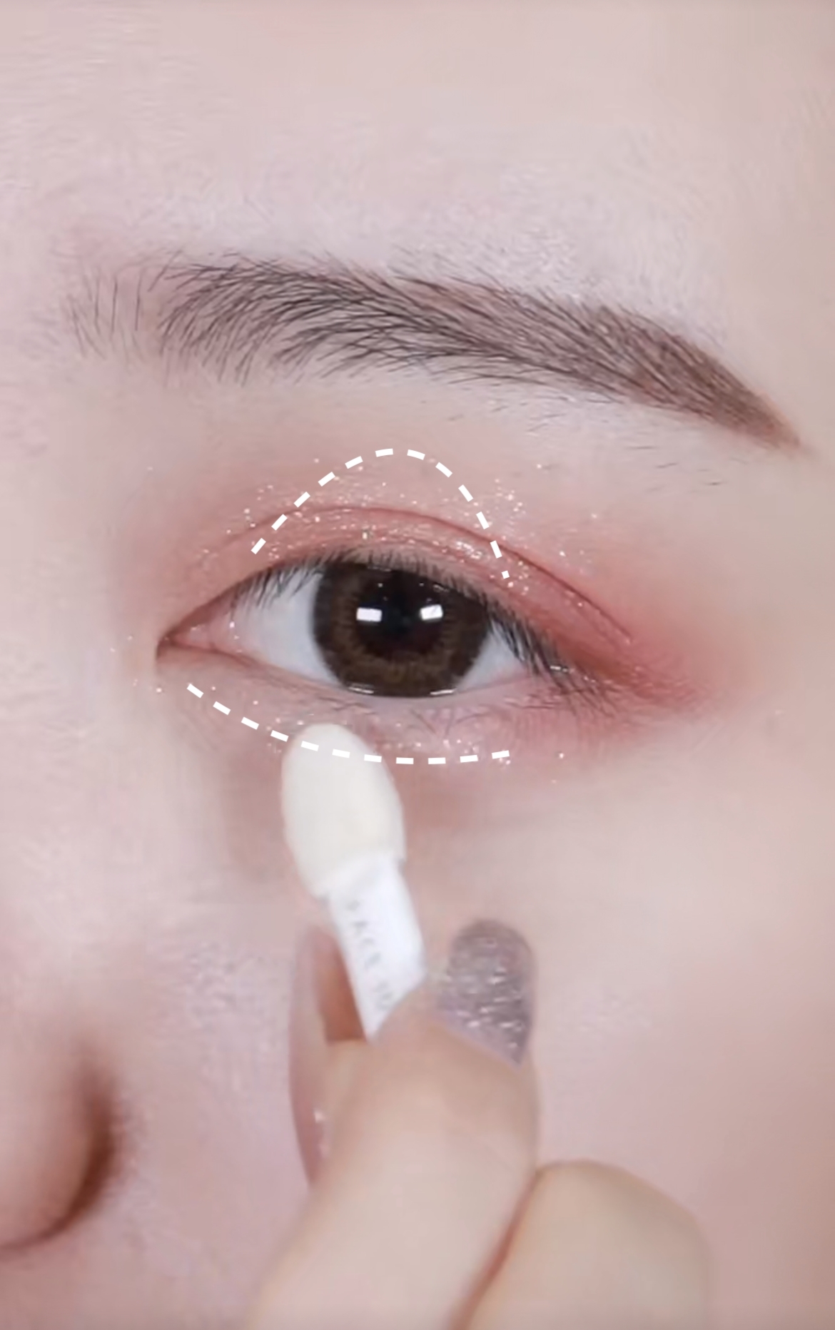最後用珠光色或金色亮片眼影來重點提亮眼頭、眼中間和卧蠶,增添立體感!整體眼妝更加bling bling~
