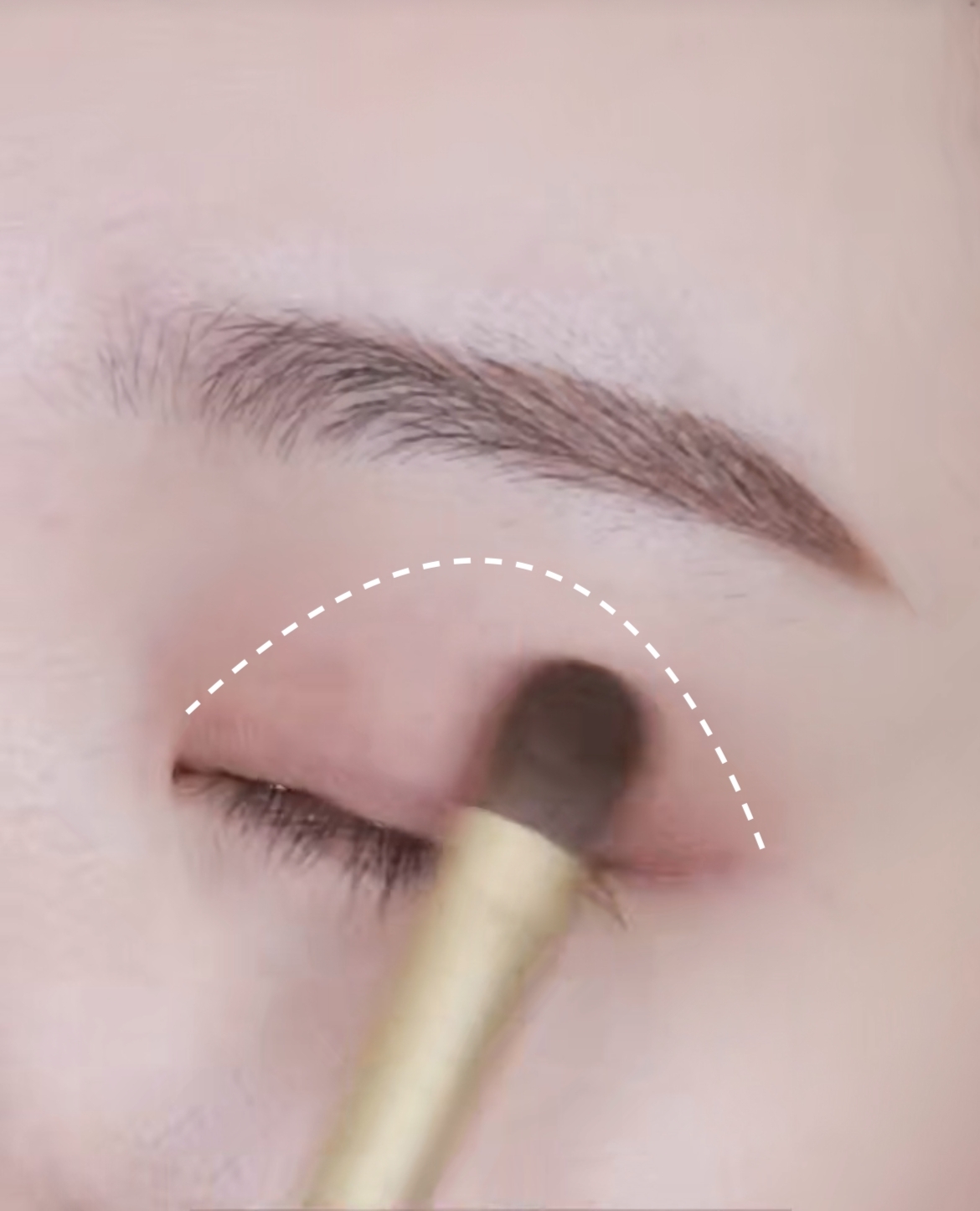 首先以霧面的藕粉色或偏灰的豆沙粉色作打底,大範圍地塗在眼蓋位置,為雙眼消腫一下~