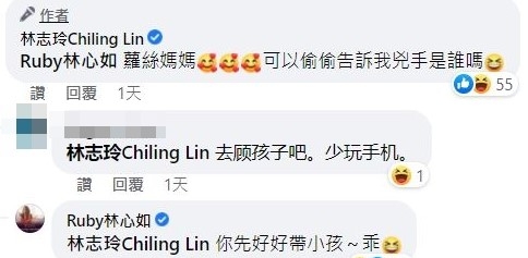 雖然風波愈演愈烈,但林志玲一直保持沉默,直到事件過了5天後她終於首度在社交網上線並一一回應各界好友的祝福,她更以3個「喊喊」表情符號回應徐若瑄,展現對得子的激動心情,另外她又搞笑地在林心如的祝福下留言,詢問由林心如監制及主演的Netflix台劇《華燈初上》劇情走向,想知道兇手到底是誰,而林心如則窩心地留言「你先好好帶小孩~乖。」可見「志玲姐姐」心情應該沒受到外間的風波影響,在坐月期間安心追劇!