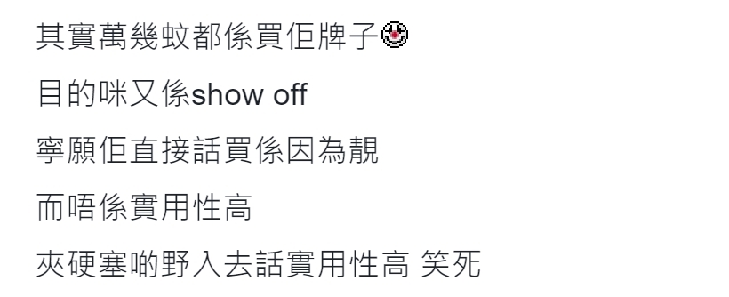 但就有網民把影片截圖到討論區,指出港女為了名牌,竟然讚這款迷你的手袋實用,樓主認為這款手袋連紙巾及酒精搓手液都放不下,質疑女生是否為了美觀而選擇什麼東西都不帶出街。