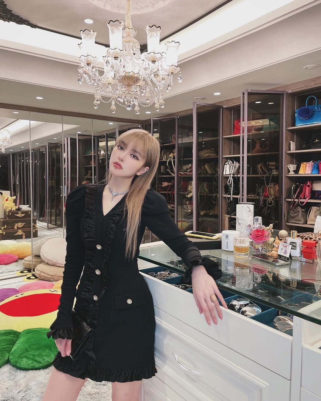 她又曾經在衣帽間拍照,可見整間房間都用作放置衣物、名牌手袋及香水等,置入式衣櫃的設計,令到衣帽間看上去更大更寬落,難怪成為她打卡的好地方!