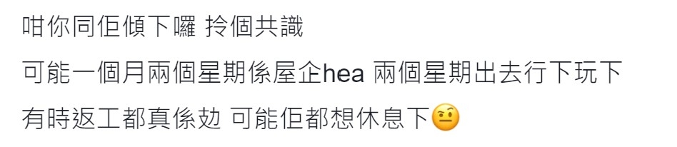 但亦有網民指兩人只是戀愛階段,如果結婚之後更要相處一輩子,如果生活方式有太大分別,亦應該盡早放手。當中更有網民留言表示好有同感,指自己男友亦是表示自己沒有特別地方想去,但可以陪對方去,但出街的時候卻只顧看手機,更反問如何可以捱過平淡期。