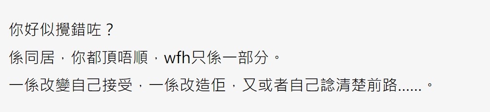 但亦有網民認為樓主應該要與女友好好溝通,指出雖然WFH只是短期的問題,但將來兩人同居或是結婚都會出現同樣情況,所以應該盡快解決兩人之間的問題,應該要互相體諒對方。