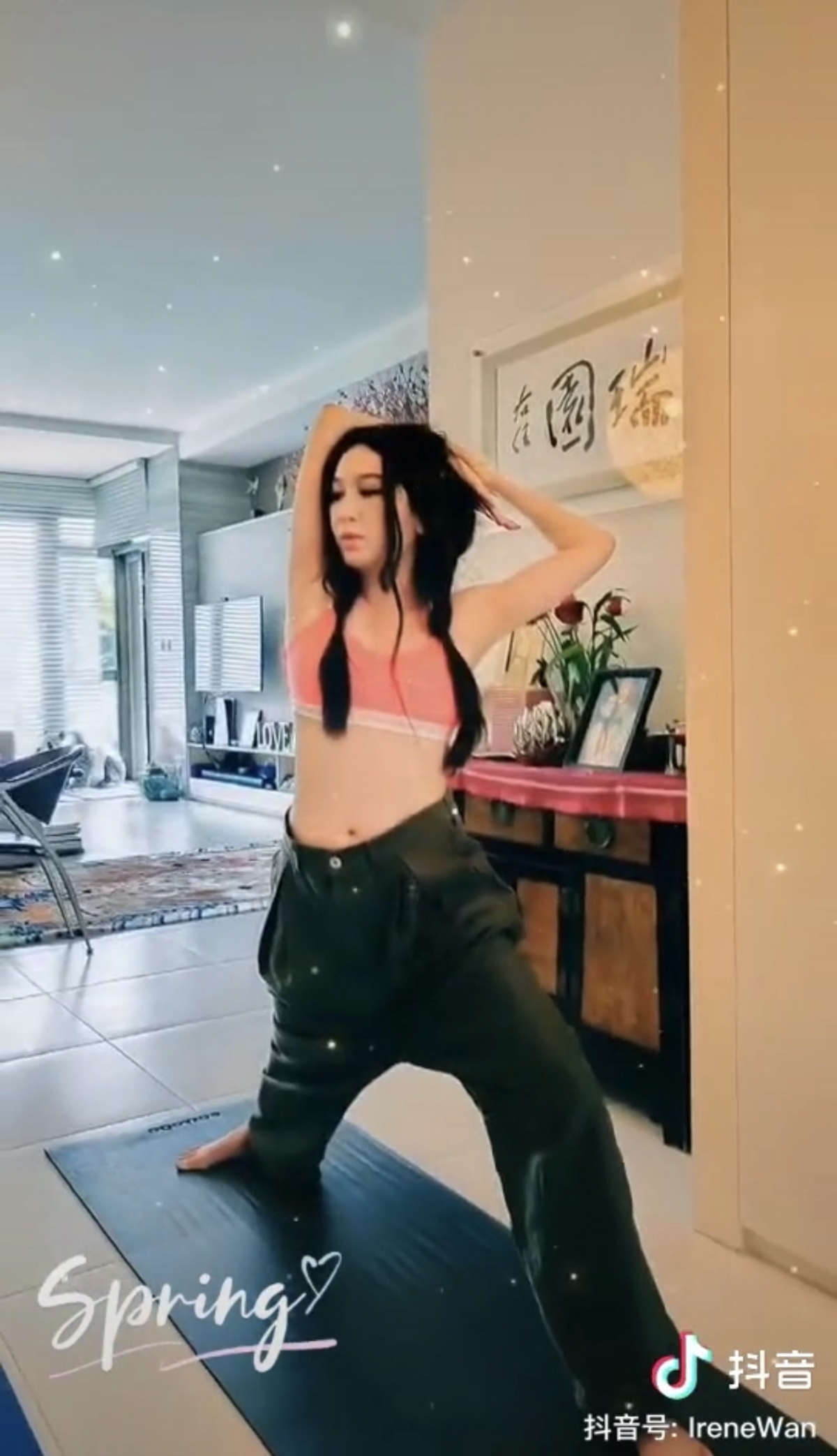 溫碧霞平時就熱愛運動,近日在抖音上傳了一則影片,影片中她穿上運動Bra Top及長褲做運動,露出纖纖細腰非常吸睛,幾乎看不出已經55歲。Irene更留言叫大家「一起動起來,齊心抗疫」,提醒大家留在家中亦不要忘記做運動。