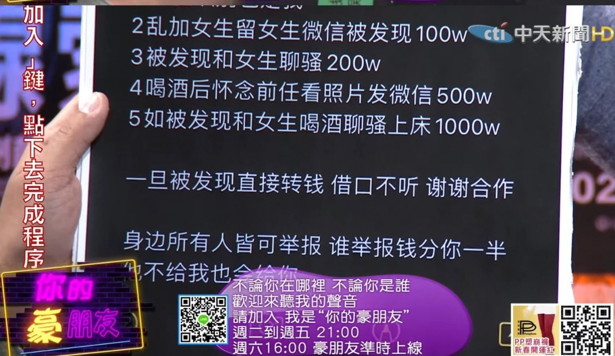 而5大規條的第一項便是,只要女方想看男方手機,男方便需要馬上給她查看,「亂加女生微信被發現」就要罰100萬人民幣﹑「被發現和女生聊騷(色情話題)」要罰200萬人民幣、若是「喝酒後懷念前任,偷看照片發微信」則要罰500萬人民幣﹑「如被發現和女生喝酒聊騷上床」更加要罰1000萬,葛斯齊指難怪汪小菲不給敢再在人前提起大S。