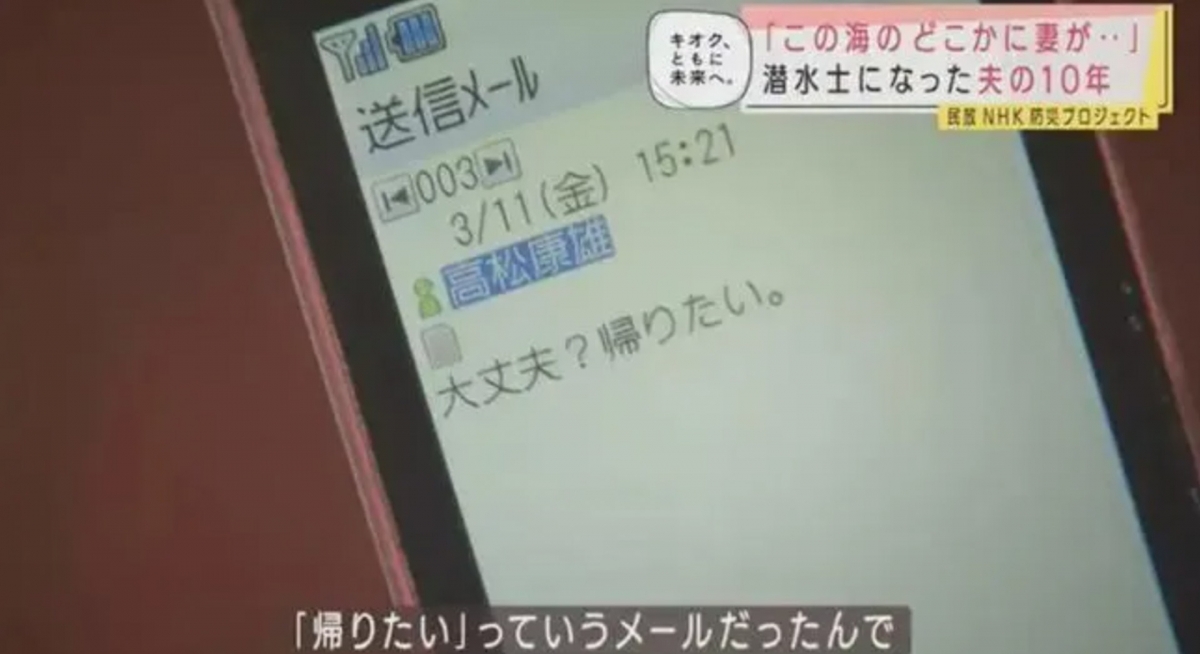 事件發生後,高松康雄從救援隊中取回太太的手機,才看到太太出事前曾經嘗試傳送的短信,表示海嘯很可怕「我想回家」,令到高松康雄下定決心要找回太太的遺體。