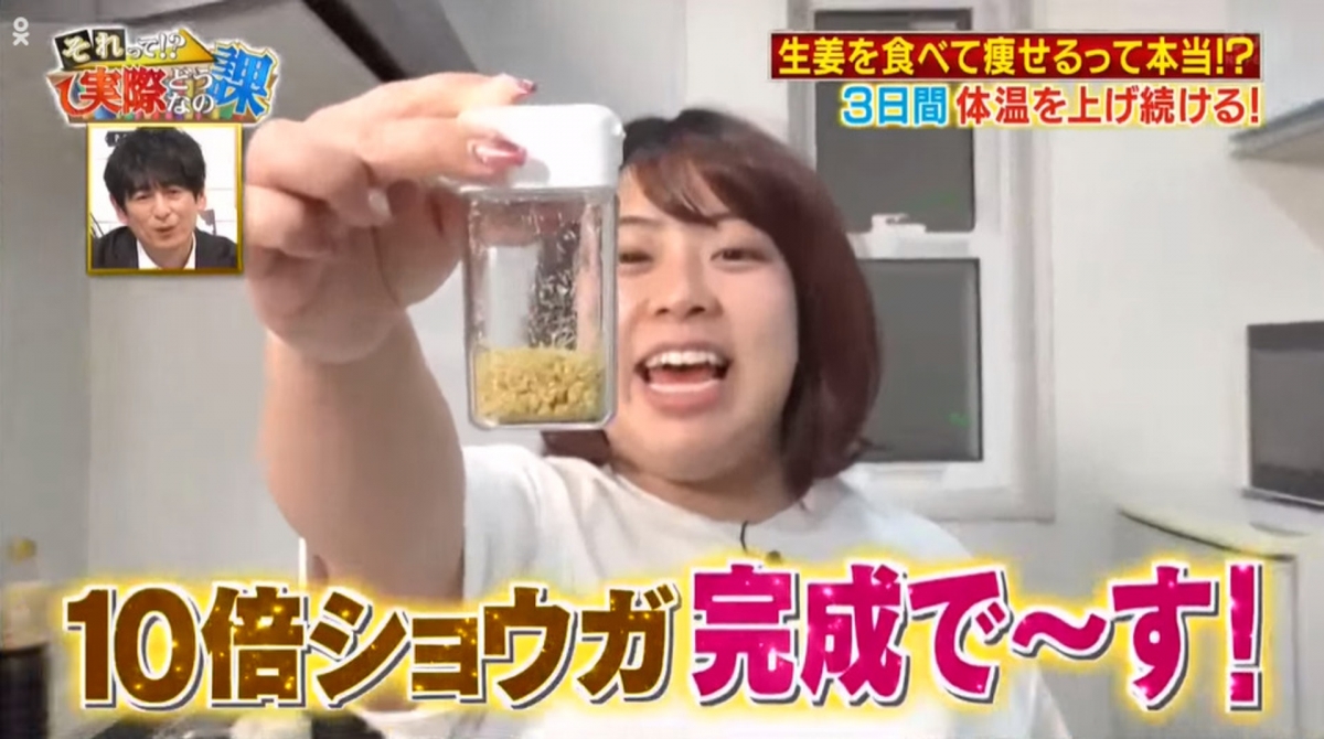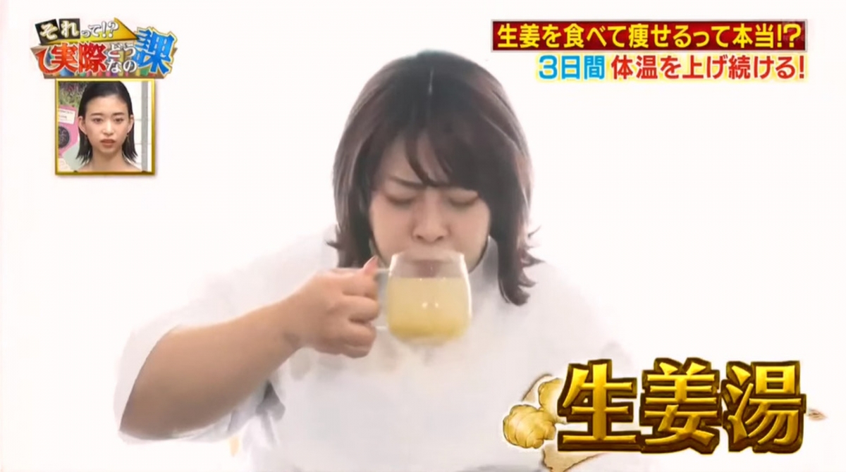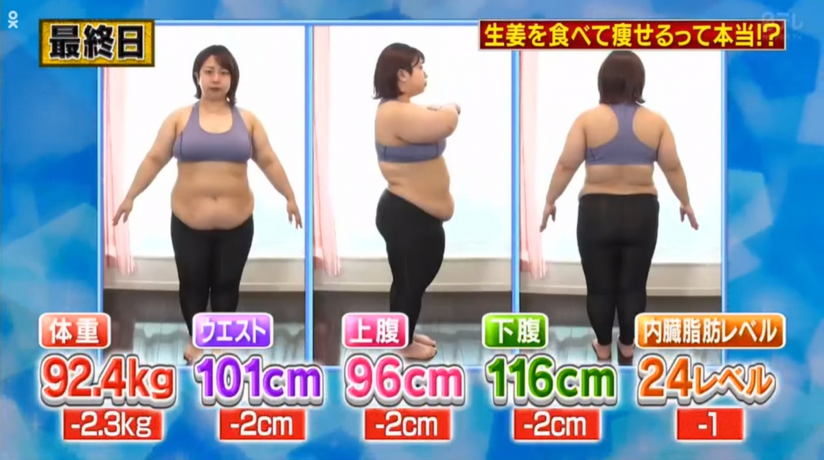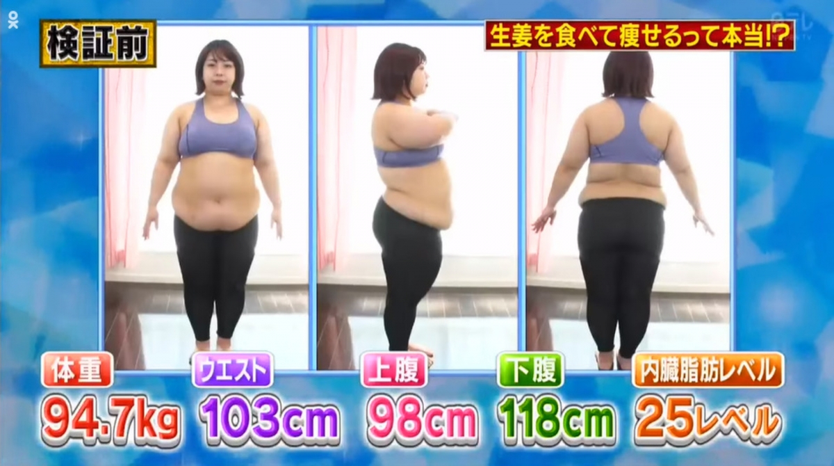 節目組找來一個身型略胖的搞笑藝人餅田,連續3日都在她的食物中加入薑做實測,餅田在進行實測前體重是94.7kg,腰圍是103cm,而内臟脂肪指數則有25。