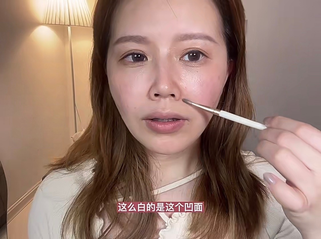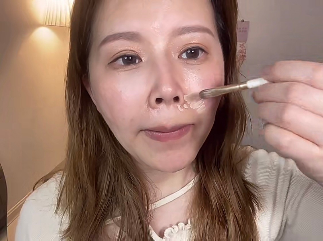 她教大家第一步要選擇比膚色深一號的粉底,在唇緣的上方拍上粉底,會令到臉上突出的部位變得不明顯。之後再選擇最淺色號的粉底,用遮瑕刷將粉底搽在法令紋凹陷處,記得要均勻地幾粉底掃開,可見只需兩步已經令到法令紋明顯消失。