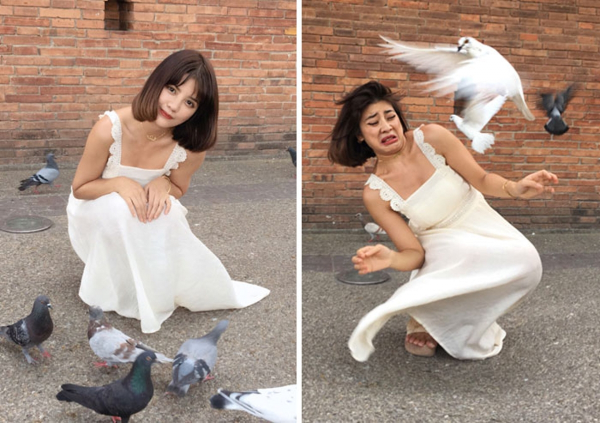 當中在twitter最多人讚好的一張照片,是她身穿白色吊帶長裙,與街上鴿子的合照,理想中Vienna笑容甜美站在鴿子身旁,事實上因為鴿子突然亂飛,她被嚇到花容失色表情失控,非常搞笑。