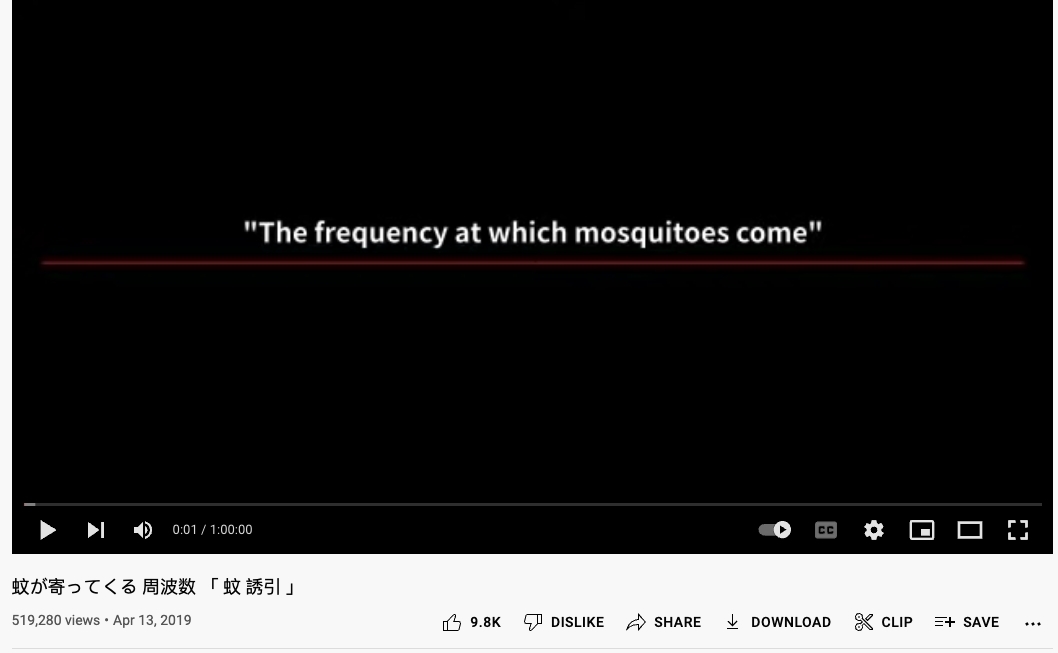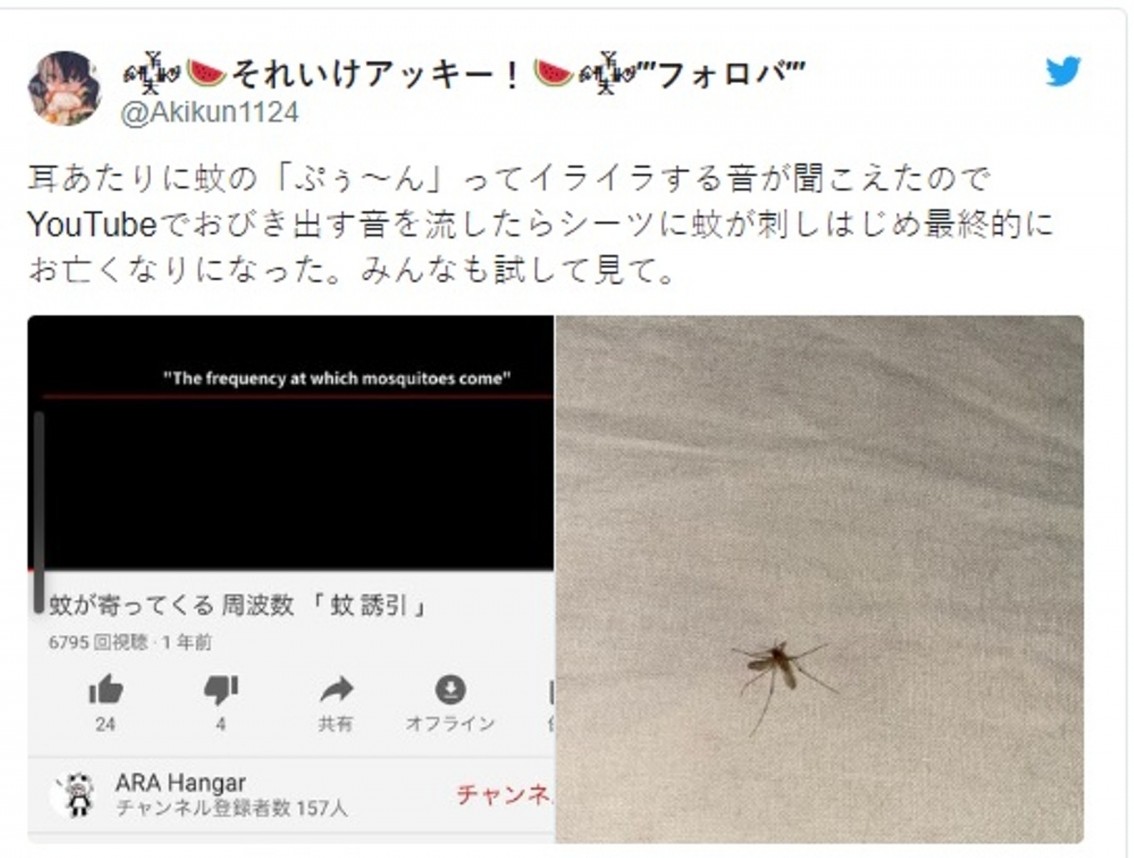 另外有1位日本網民就分別分享自己試過的神奇「滅蚊」方法,兩者都不少使用者認證有效並瘋傳,有一個帳號名為「Akikun1124」的網民在Twitter表示,因為最近耳邊不斷有蚊子飛來飛去「嗡嗡聲」,令他不勝其煩,結果在Youtube發現了一段名為「吸引蚊子頻率」(蚊が寄ってくる周波数「蚊誘引」)的影片,這段片播放時會發出像警號般的聲音,能吸引蚊子接近,令他可以一次過用床單捕獲到大量蚊子。將牠們「消滅」。