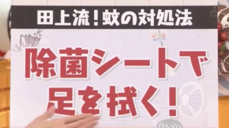 原來人的皮膚上有一種名為「常在菌」的細菌,這種細菌愈多就愈易惹蚊咬,所以田上大喜建議大家外出前可以用消毒紙巾抹腳,他和妹妹曾用此方法再做實驗,對比殺菌前和殺菌後被蚊咬的次數,結果果然大有減少,大家都不妨試試看!