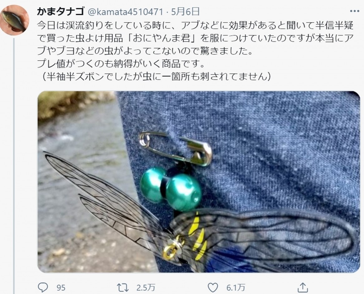 至於另一位日本網民則在2021年在twitter發文表示自己某天去釣魚店買東西時意外發現一款聲稱能嚇跑蚊蟲的「蜻蜓別針」,他半信半疑地買了回去試試看,結果一整天穿著短袖短褲時都沒有受到蚊子干擾,有專家就表示這款別針是仿照一款名為「無霸勾蜓」的蜻蜓外觀,因為這款蜻蜓被稱為「蜻蜓界巨無霸」,平常以昆蟲為食為主,或許是因為它兇猛的捕食習性才「保護」到帖主不受蚊子滋擾。