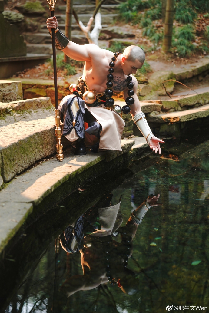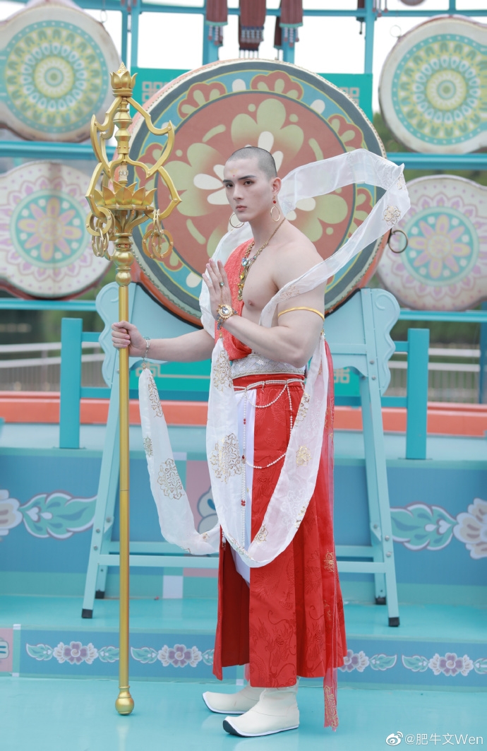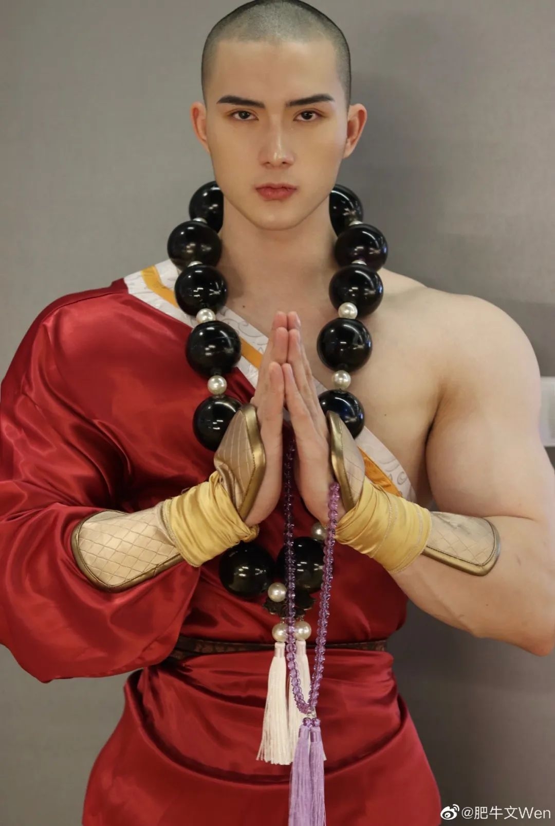 其實「肥牛文Wen」在扮演「唐僧」前,就曾經因為Cosplay過網路遊戲中的「武僧」角色而被盛讚文質彬彬的外貌很有「僧人」的神韻,加上他完美的「倒三角」身材就更引人注目。