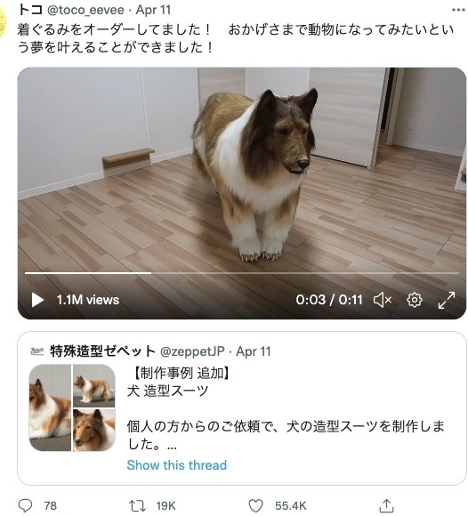 這名日本男子名叫Toco,今年30多歲,他從小就十分喜愛四肢爬行動物,甚至會模仿牠們用雙手雙腳在地上爬行,最近他為了更加盡情「體驗」模仿爬行動物的樂趣,竟然花了200萬日元向一間特殊造型工作室,訂製了一套「狗狗Cosplay服」,而且他將穿上這套服裝後的造型放上Youtube及Twitter跟網民分享,很多人都表示完全看不出片中的狗竟然是真人在扮演,紛紛轉發影片表達震驚,至今這段片已經有超過100萬點擊和近50萬個Like!