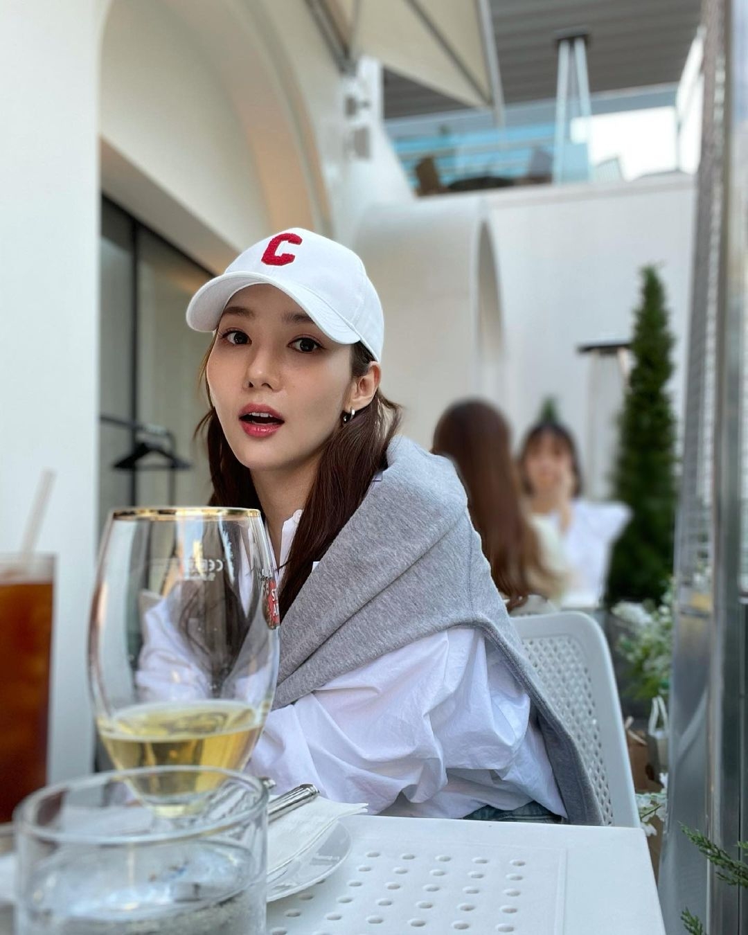 像朴敏英就選擇以一頂配有紅字「C」的白色棒球帽來配搭oversize的白恤衫,再搭上一件灰色外套,休閒又充滿活力感!