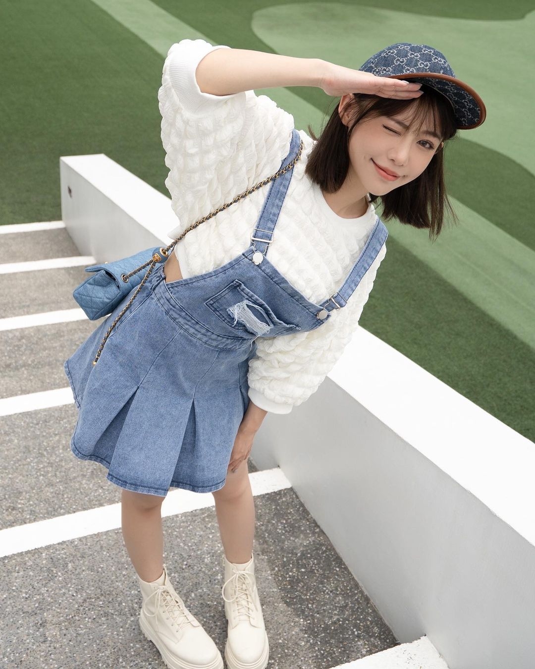 像台灣藝人紀卜心就以青春可愛的牛仔連身短裙,再襯上一頂GUCCI牛仔CAP帽,十分好看!