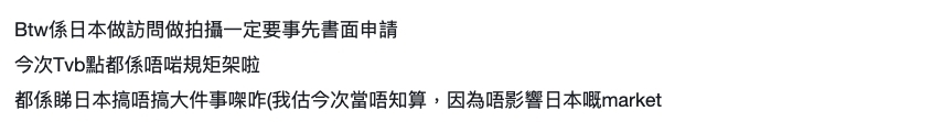 其實無綫2021年的旅遊節目《#好掛住日本》亦曾遭網民質疑主持人吳業坤和周奕瑋,非法利用奧運採訪簽證拍旅行節目。因為有網民指出如若在日本進行拍攝一定要先申請,雖然不知道這次攝製對是否有違法,但日本有肖像權,就算在街頭拍攝都要小心地處理。