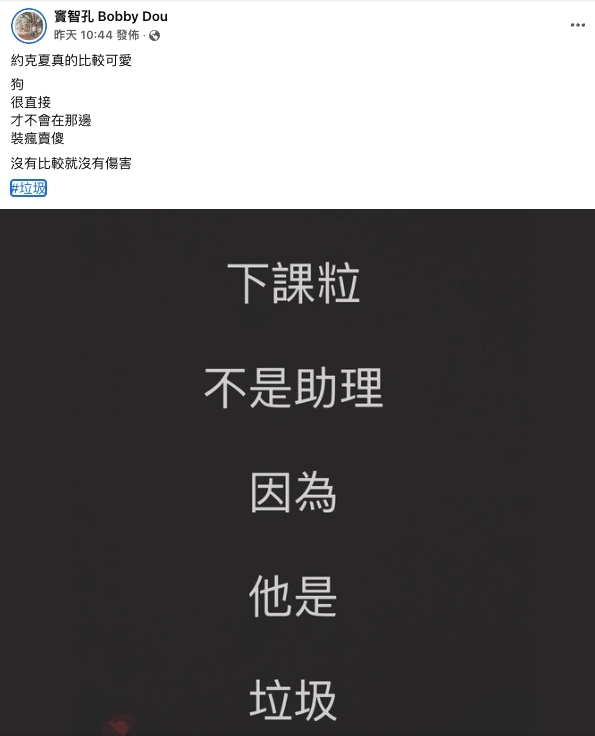 她以為這樣就能夠避免兩人有所爭執,直到有一天她覺得很疲憊,才選擇做回自己:「我輸了,我不要再演了!」黃嘉千也坦言這樣會傷害了丈夫。離婚消息傳出後,她的朋友竇智孔更在FB上暗指夏克立是垃圾:「下課粒 不是助理 因為 他是 垃圾」還留言說:「朋友家的狗咬人」疑似夏克立對不起黃嘉千,導致兩人婚姻破裂。