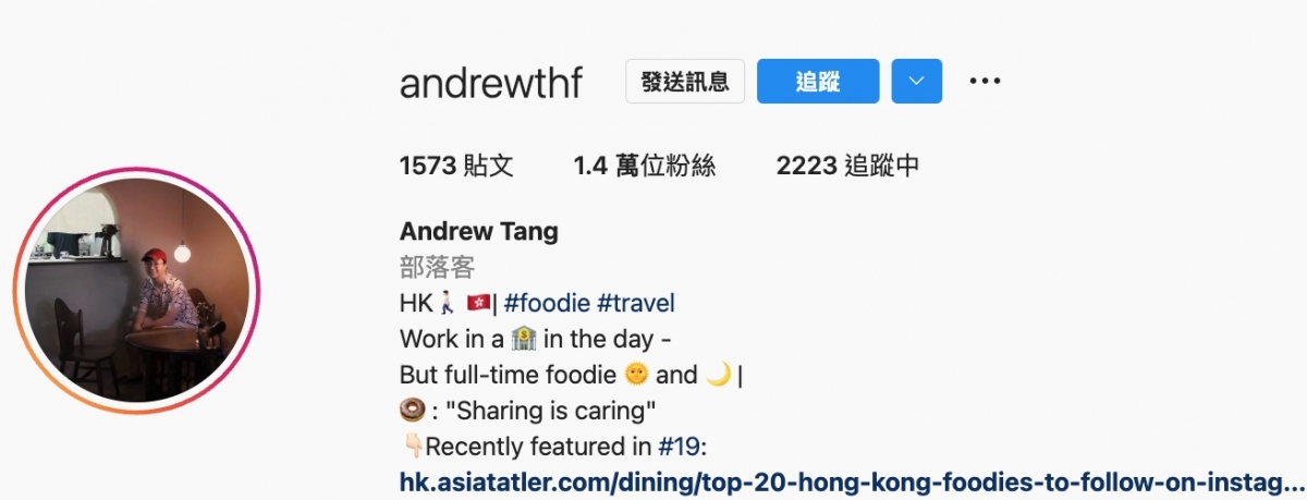 在銀行上班的Andrew,自稱是個徹頭徹尾的美食愛好者,不時分享精緻的中、西、日式等的食物,而且相片都超近對焦食物,清楚看見美食的樣貌、顏色和光澤,非常吸睛!