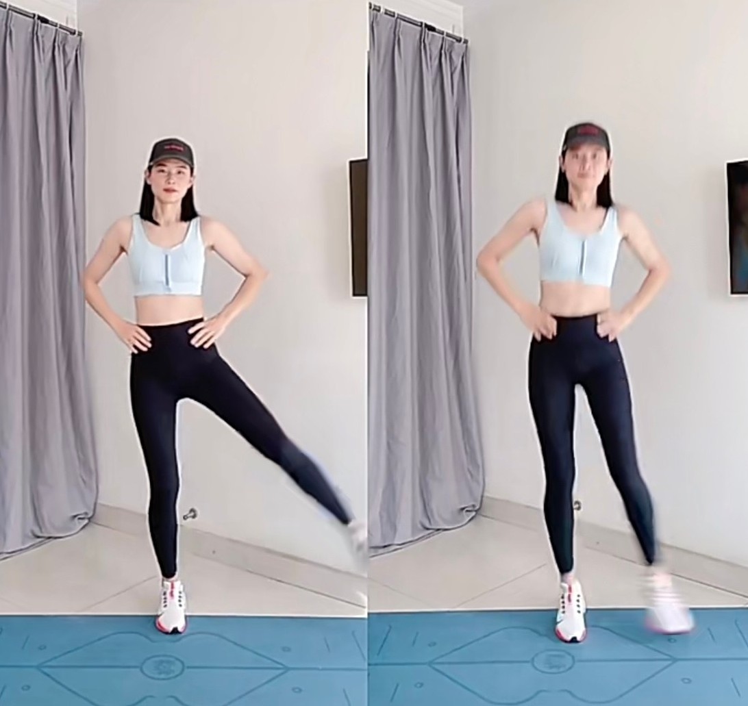 最後一個動作是雙手扶著腰,然後左右腳向側抬起,如果想效果更明顯,就可以將雙腳好像鐘擺一樣擺動。