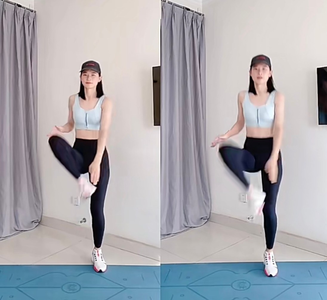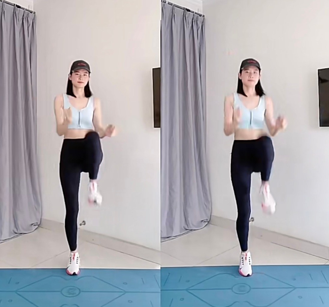 第二個動作是雙手在下拉的時候,同時左右腳要提起,膝頭要幾乎觸到手踭位置,注意在做的時候,雙手要盡量伸直再向下拉。