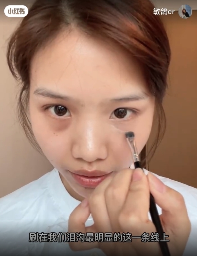 再把扁頭刷豎起來看,用尖尖精準地刷在淚溝最明顯的這一條線上,不要著急暈開,等待10秒讓它自然乾掉。