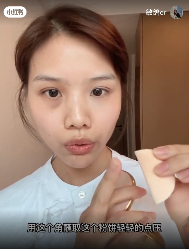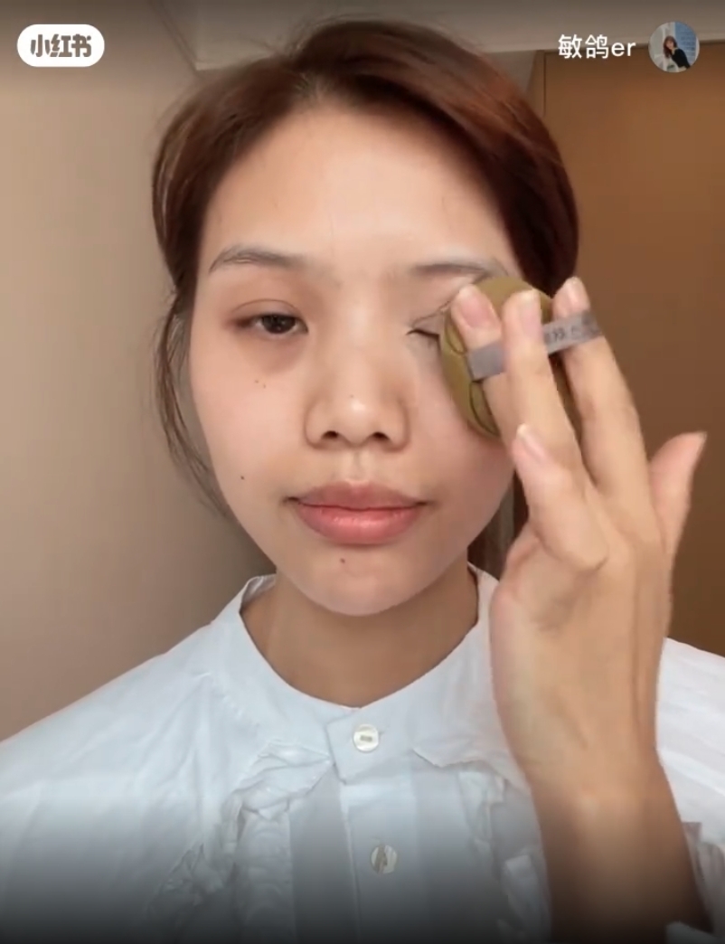 遮完之後會發現還是會有一點點反光。用一個小小的粉撲,然後把它對折,用邊邊的角沾取適量的粉餅,再輕輕的點壓在黑眼圈和淚溝上定妝,反光就會瞬間消失,變成霧面的啞光感。