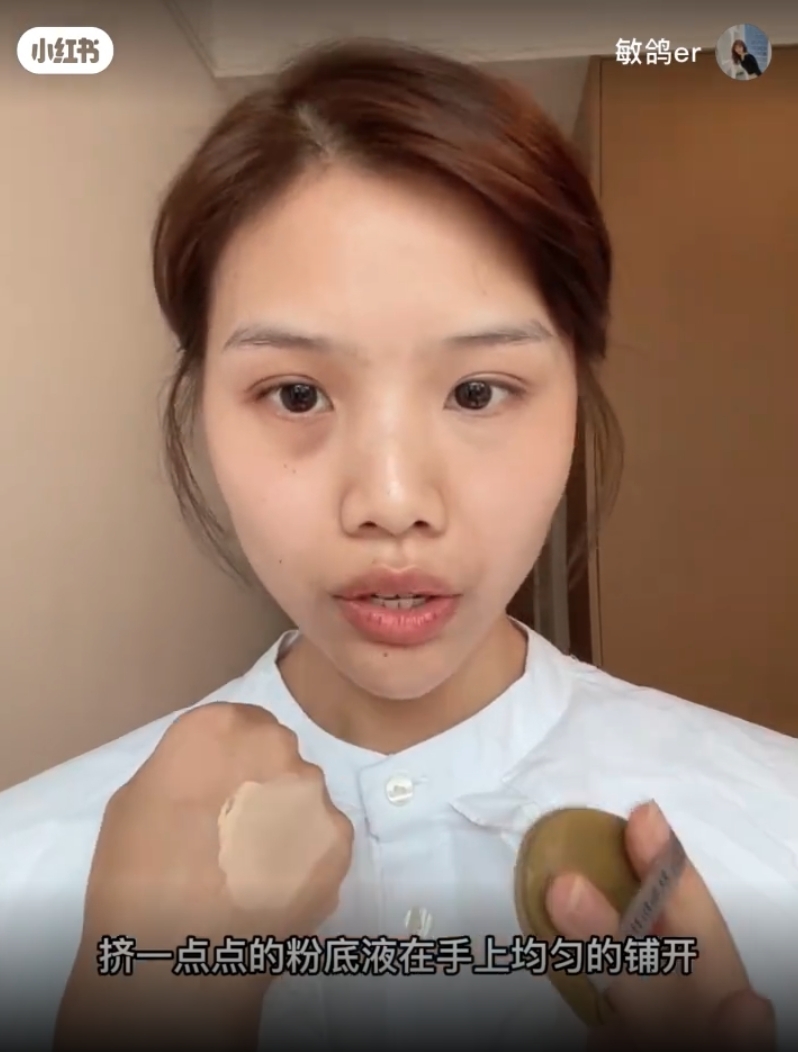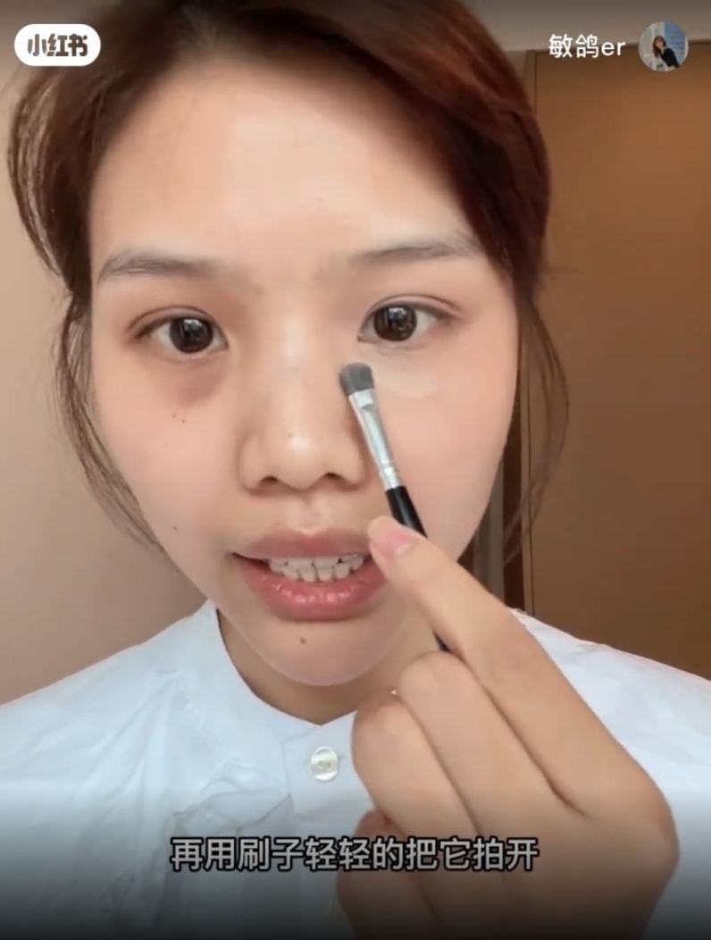這時候就來看一看第一遍的黑眼圈被遮住了沒,如果沒有的話就要少量多次繼續按照剛剛的方法重複疊加。那如果已經遮住了,就準備要上一層薄薄的粉底液去中和一下黃色!