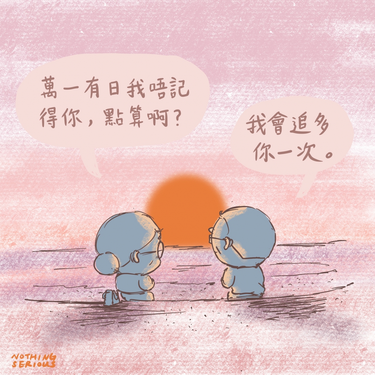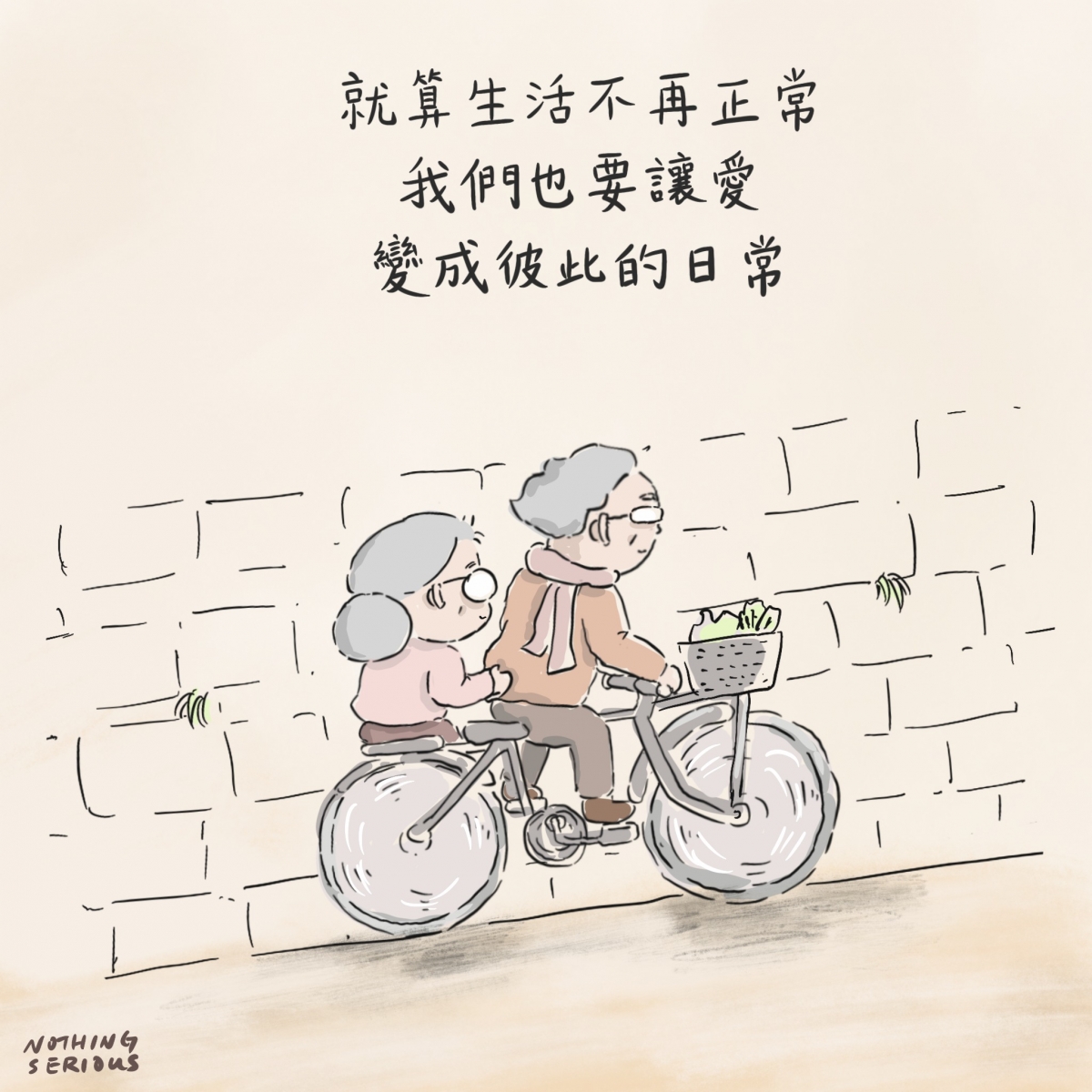情侶插畫常以可愛角色和高甜情節大放閃光彈,《Nothing Serious》作者Kelvin曾試過創作年輕情侶插畫,卻發現街上公公婆婆牽手的畫面更讓他感到幸福,於是他轉為描繪一對老太太老先生的生活日常,認為愛不一定是「甜蜜」的代名詞,愛也可以平淡如水。