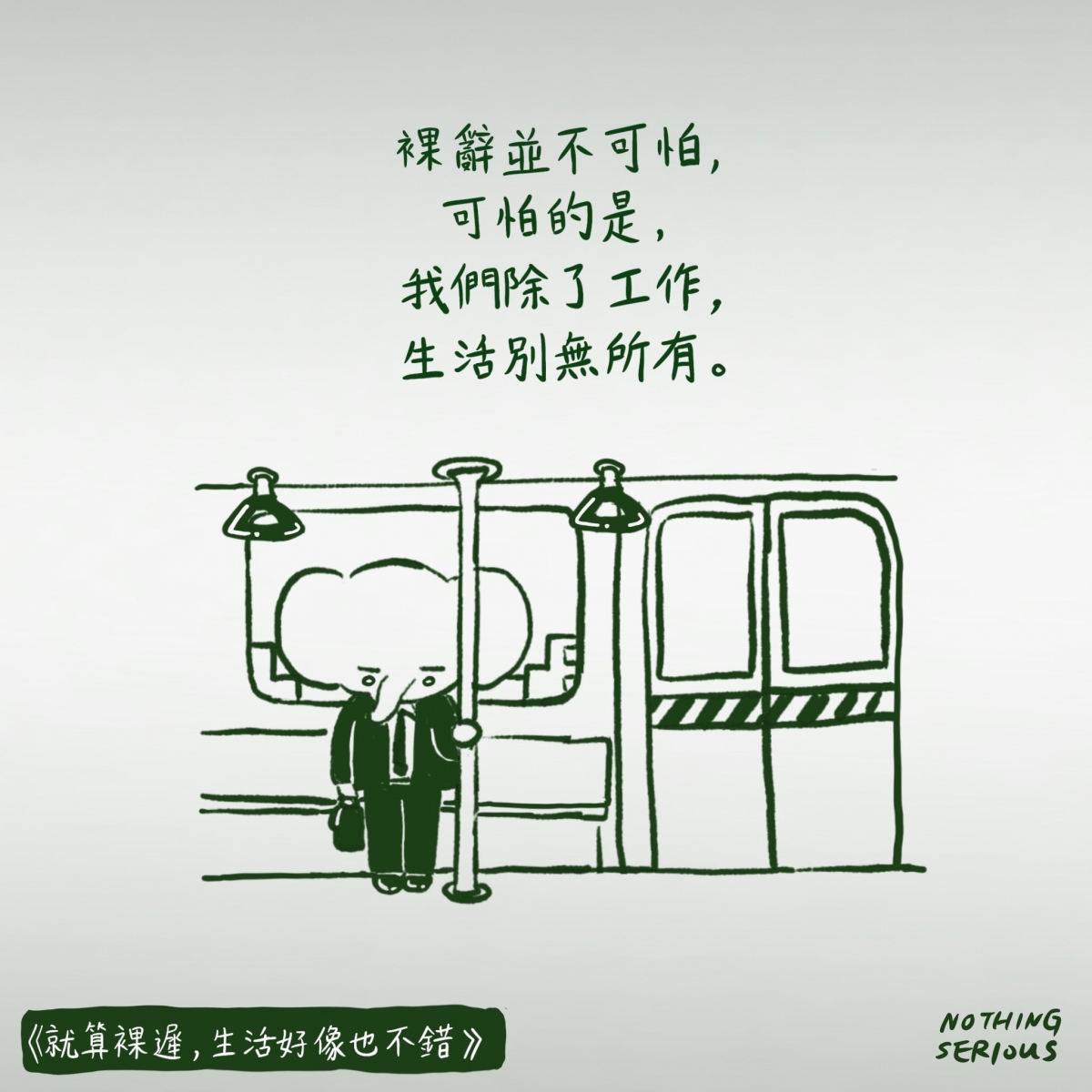 他想告訴大家裸辭並不可怕,反而要學懂好好休息,照顧自己的心靈,再認清目標去追夢,於是《Nothing Serious》便誕生了裸辭的笨笨象,辭去充滿壓力的工作後,笨笨象發現身邊有許多值得珍惜的人和事,連逛街買到特價品也感到幸福,雖然未找到工作,卻找到真正的自己。