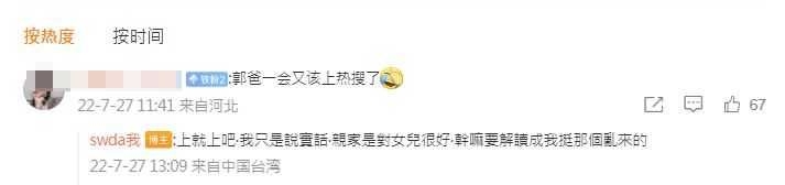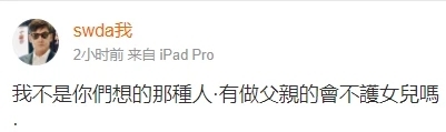 罵完女婿後,郭爸在微博上消失了一個月,近日再度發聲,大晒家裡的好菜:「休息夠了重新開幕」結果卻又遭到網友們的質問:「向太哄好了?」疑似暗示郭爸被向太收買。郭碧婷父親再度暴怒,更與網民對罵:「就一定要這麼瞧不起人,你隨隨便便的一句(話)就夠傷人的」