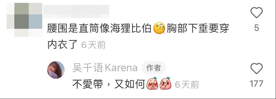 有網民留言:「胸部下垂要戴內衣了」,但吳千語就親自霸氣回覆:「不愛帶,又如何」。另外有網民幫她平反,指出吳千語一向很少P圖,所以上傳的照片都是真實的模樣,仍然非常美。