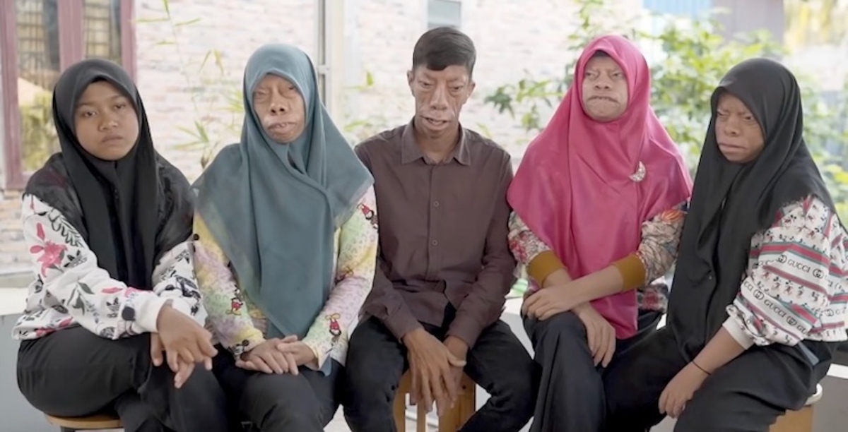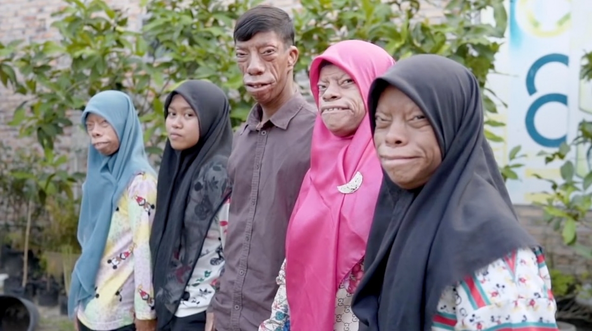 印尼蘇門答臘島有一戶人家,在5個兄弟姊妹中有4個人的長相都超像 「河馬」,他們的臉上有明顯的皺紋,而且眼睛較長且凸出,嘴巴又大又凸。據了解,這5個兄弟姊妹因為遺傳了爸爸的「河馬」基因,所以長相神似河馬,只有最小的妹妹遺傳到媽媽的基因,長相正常。