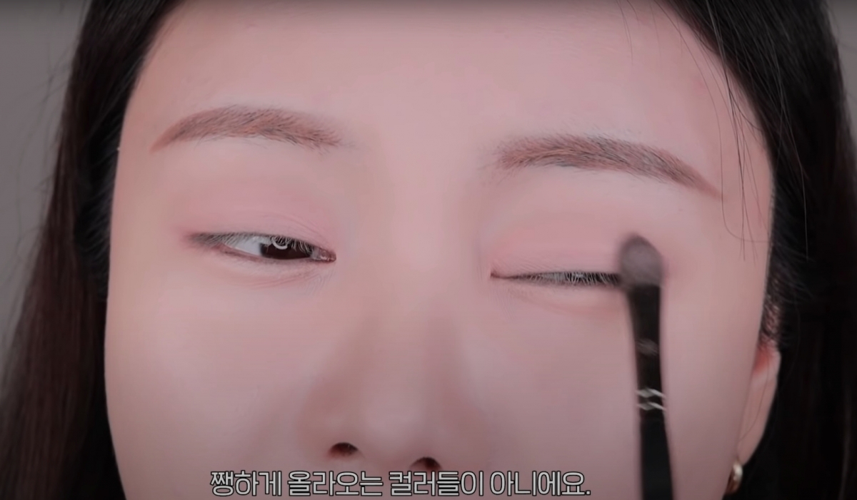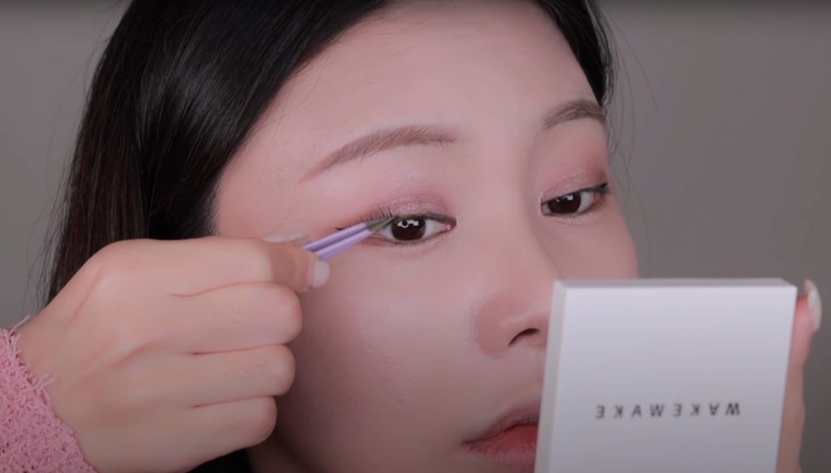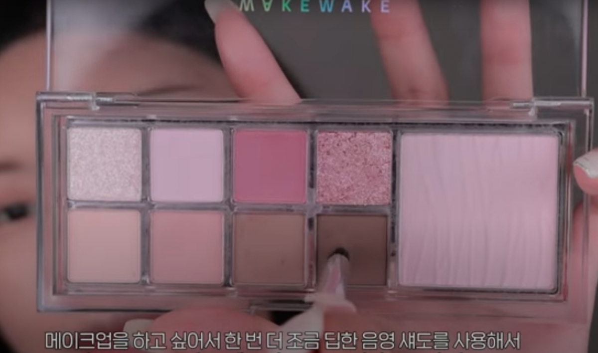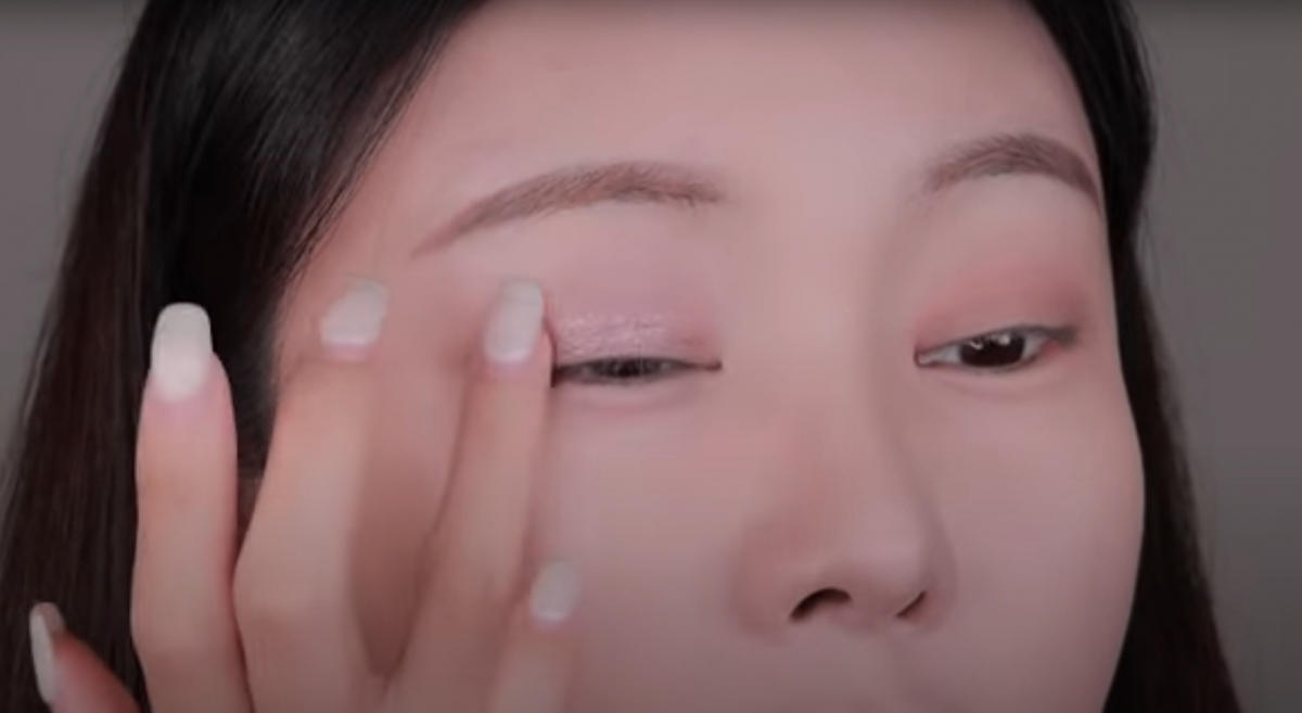 之後在上眼皮中間用粉色的珠光眼影作提亮,再在眼尾三角位掃上粉色和適量的啡色眼影,加強立體感。