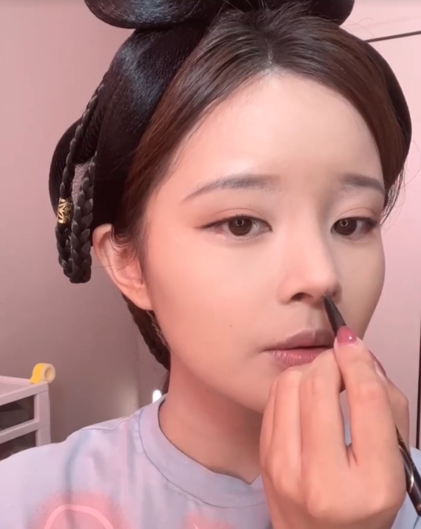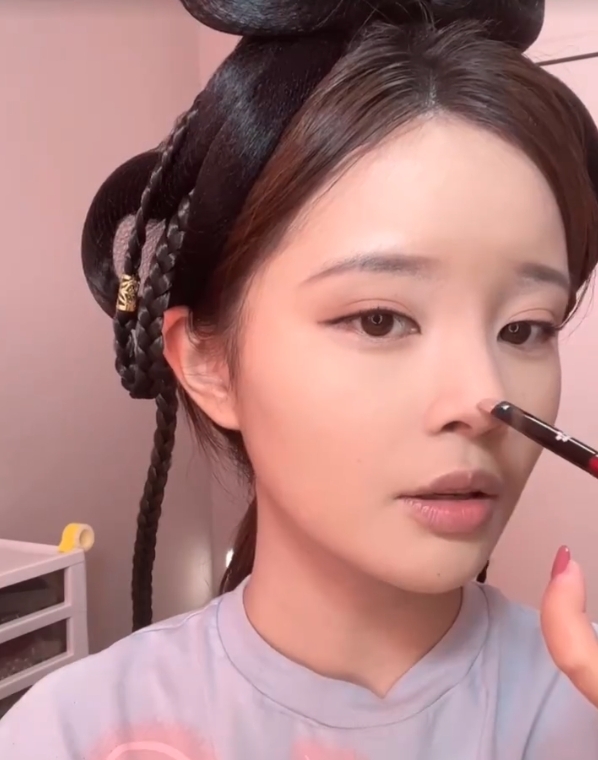 由於趙露思鼻子的山根位置比較高,所以需要用珠光來提亮山根,讓鼻子看起來比較高。而因為我們畫的是假的,所以角度一定要找好。