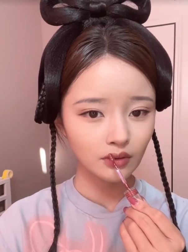 再塗上葡萄暗紅色系的唇蜜,再學她甜美又有點害羞的笑容就大功告成了!記得還要帶上復古宮廷假髮啊!